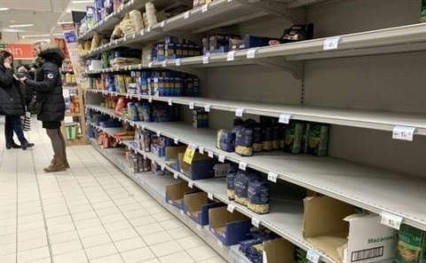 | Des rayons de pâtes et de riz dévalisés dans un supermarché de Lille, le 13 mars 2020. |