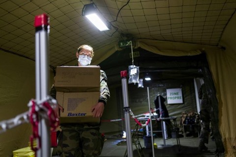 | Installation de l'hôpital de campagne près de l'hôpital Emile Muller à Mulhouse, le 24 mars. |