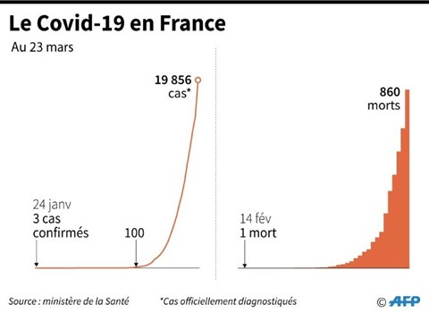 | Évolution du nombre de cas de COVID-19 en France, au 23 mars |