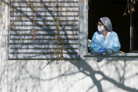 | Un membre du personnel soignant se repose quelques minutes à la fenêtre de l'hôpital Emile Muller à Mulhouse, le 24 mars. |