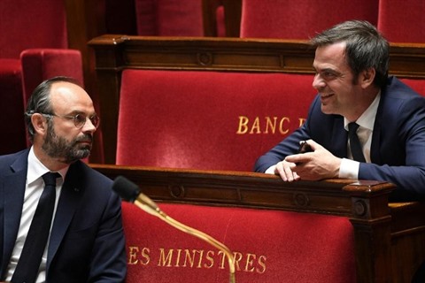 | Le Premier ministre français Edouard Philippe et le ministre de la Santé Olivier Véran le 28 avril à l'Assemblée nationale à Paris. |