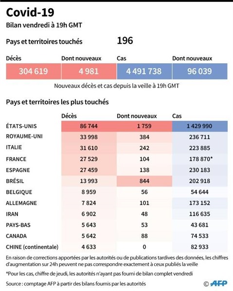 La pandémie du nouveau coronavirus a fait au moins 305.000 morts dans le monde depuis son apparition en décembre en Chine, selon un bilan établi par l'AFP à partir de sources officielles vendredi 15 mai à 19h00 GMT.