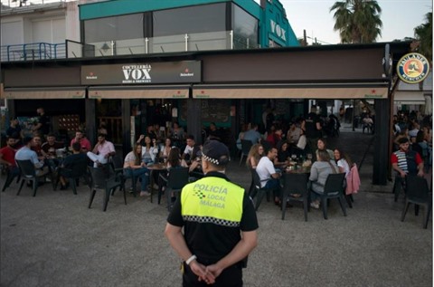 | Un policier surveille le respect de consignes anticoronavirus dans un restaurant de Malaga le 23 mai. |