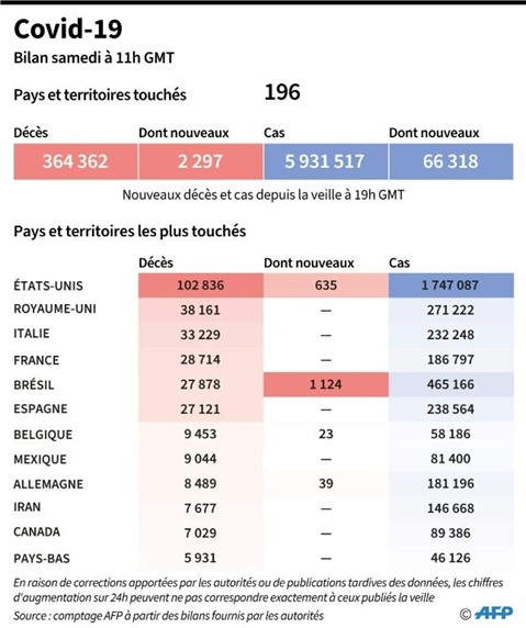 La pandémie a fait au moins 364.362 morts dans le monde depuis son apparition en décembre en Chine, selon un bilan établi par l'AFP à partir de sources officielles samedi à 11h00 GMT.