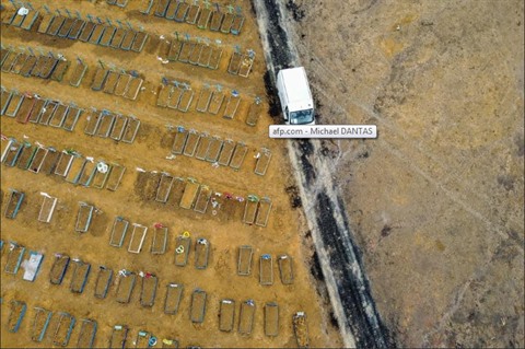 | Vue aérienne d'une nouvelle zone dédiée aux tombes de personnes décédées du coronavirus, le 12 juin 2020 à Manaus, au Brésil. |