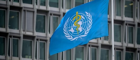 | Le drapeau de l'Organisation mondiale de la santé à Genève, le 5 mars. |