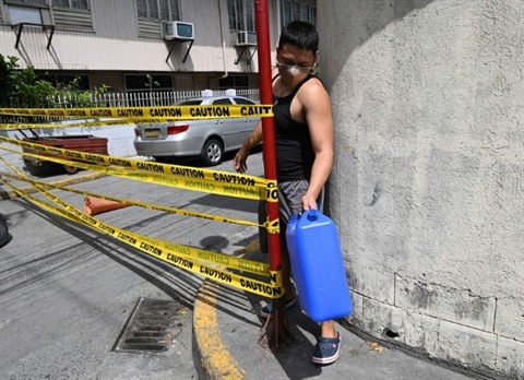 | Un homme masqué, un bidon d'eau à la main, franchit la limite d'une rue confinée pour cause de COVID-19 à Manille, le 10 mars. |