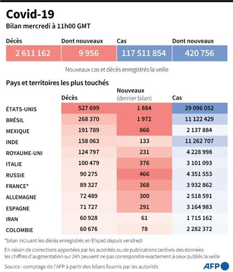 La pandémie a fait au moins 2,6 millions de morts dans le monde depuis fin décembre 2019, selon un bilan établi par l'AFP à partir de sources officielles mercredi à 11h00 GMT.