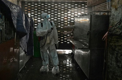 | Désinfection au marché d'Orussey à Phnom Penh, le 4 avril. |