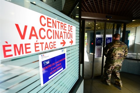 | Un soldat vient se faire vacciner contre le COVID-19 à l'hôpital militaire Robert Picque à Villenave-d'Ornon (Sud-Ouest de la France), le 6 avril. |