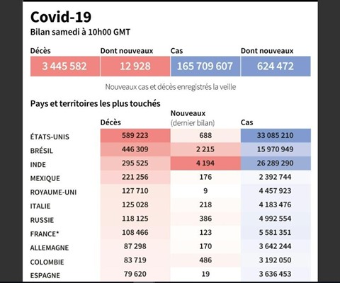 La pandémie a fait au moins 3.445.582 morts dans le monde depuis fin décembre 2019, selon un bilan établi par l'AFP à partir de sources officielles, samedi en milieu de journée.