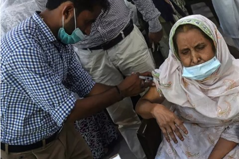 | Une femme reçoit une dose de Sinopharm à Karachi, au Pakistan, le 25 mai. |