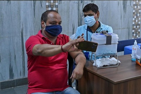 | Un homme fait un selfie tandis qu'il reçoit une dose de vaccin anti COVID-19 à New Delhi, le 26 mai. |