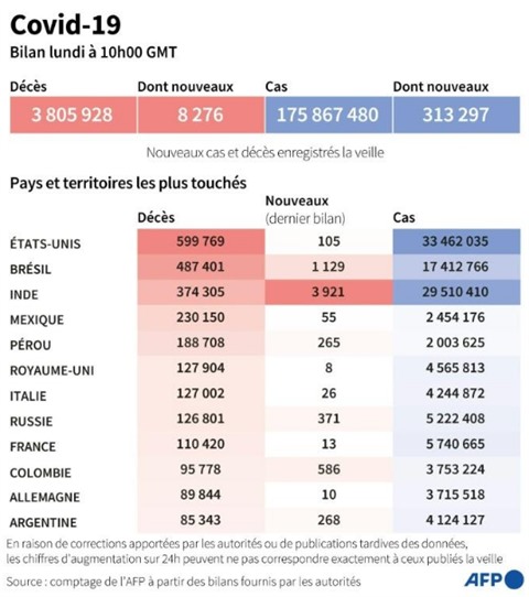 La pandémie a fait plus de 3.805.928 morts dans le monde depuis fin décembre 2019, selon un bilan établi par l'AFP à partir de sources officielles lundi 14 juin à 10h00 GMT.