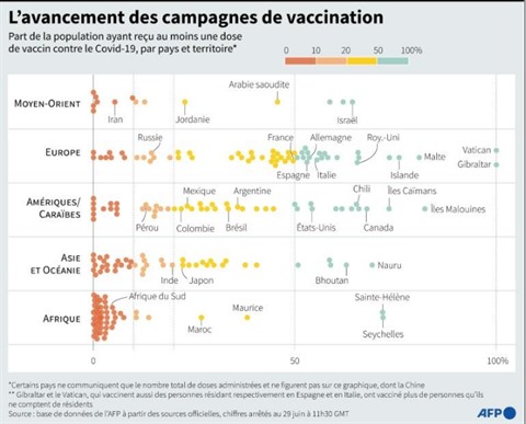 Plus de trois milliards de doses de vaccins anti-COVID ont été administrées dans le monde, selon un comptage de l'AFP réalisé mardi 29 juin à 09h00 GMT à partir de sources officielles.
