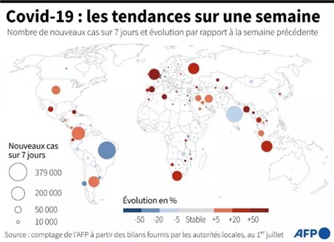 | Nombre de nouveaux cas de COVID-19 recensés sur sept jours et évolution par rapport à la semaine précédente, par pays, au 1er juillet. |