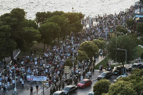 | Des manifestants anti-vaccins défilent à Thessalonique, en Grèce, le 14 juillet. |