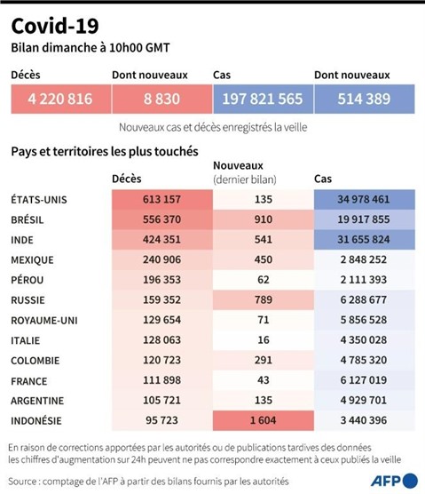 La pandémie a fait plus de 4,22 millions de morts dans le monde depuis fin décembre 2019, selon un bilan établi par l'AFP dimanche 1er août à 10h00 GMT. Les États-Unis sont le pays ayant enregistré le plus de décès (613.157), devant le Brésil (556.370) et l'Inde (424.351).