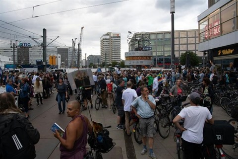| Des manifestants contre les mesures sanitaires en Allemagne se sont rassemblés sur l’Alexanderplatz à Berlin, le 1er août. |
