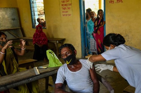 | Un homme se fait vacciner contre le COVID-19 dans un village près de Guwahati, en Inde, le 6 août. |