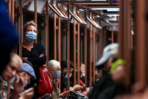 | Une femme porte un masque dans le métro de Moscou le 11 août. |