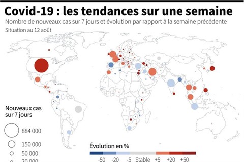 La pandémie a fait au moins 4.333.013 morts dans le monde depuis fin décembre 2019, sur plus de 205,3 millions de contaminations, selon un bilan établi à partir de sources officielles vendredi 13 août.Les États-Unis sont le pays ayant enregistré le plus de décès (621.204), devant le Brésil (568.788), l'Inde (430.254), le Mexique (246.811) et le Pérou (197.209).