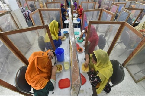 | Cantine dans une usine avec cloisons pour éviter les contaminations au COVID-19 à Dacca, le 17 août. |
