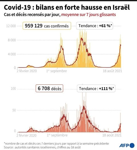 | Cas de COVID-19 et décès quotidiens liés au COVID-19 officiellement recensés en Israël au 18 août. |