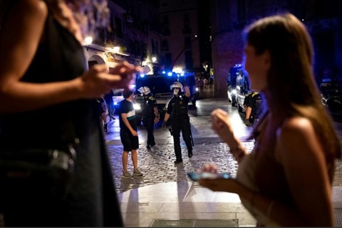 | Des policier demandent à des personnes de respecter le couvre-feu, le 17 juillet à Barcelone. |
