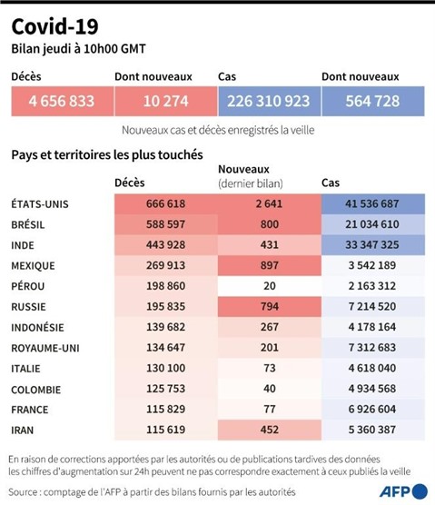 La pandémie de COVID-19 a fait au moins 4.656.833 morts dans le monde depuis fin décembre 2019, selon un bilan établi jeudi à 10h00 GMT par l'AFP à partir de sources officielles. Les États-Unis sont le pays ayant enregistré le plus de décès (666.618), devant le Brésil (588.597), l'Inde (443.928), le Mexique (269.913) et le Pérou (198.860), selon les chiffres officiels. L'OMS estime, en prenant en compte la surmortalité directement et indirectement liée au COVID-19, que le bilan de la pandémie pourrait être deux à trois fois plus élevé.