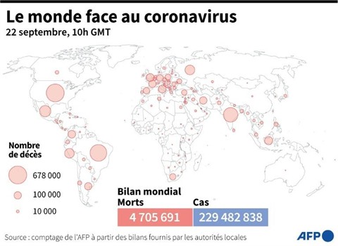 La pandémie provoquée par le nouveau coronavirus a fait au moins 4.705.691 morts dans le monde depuis fin décembre 2019, selon un bilan établi par l'AFP à partir de sources officielles mercredi en milieu de journée.