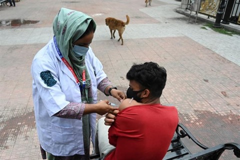 | Un homme se fait administrer le vaccin Covishield contre le COVID-19 sur un marché de Srinagar, en Inde, le 24 septembre |