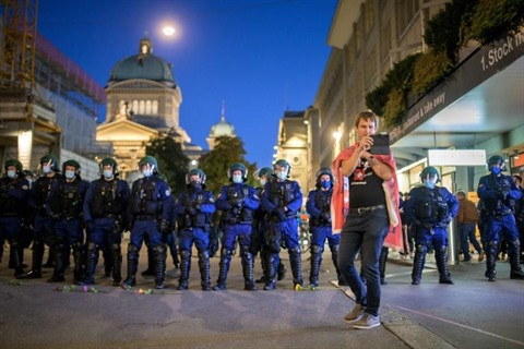 | Un protestataire face aux policiers lors d'une manifestation contre le passeport vaccinal, le 23 septembre à Berne |
