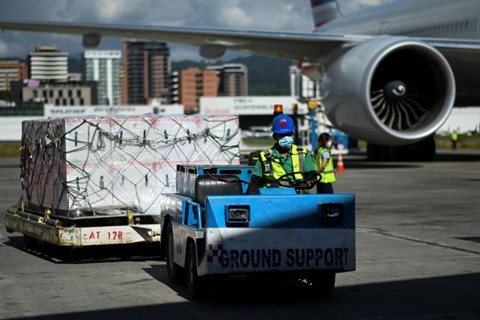 | Des doses de vaccins contre le COVID-19 données par les États-Unis arrivent à l'aéroport de Guatemala City, le 20 juillet. |