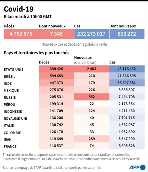 La pandémie a fait au moins 4.752.875 morts dans le monde depuis fin décembre 2019, selon un bilan établi par l'AFP à partir de sources officielles mardi 28 septembre à 10h00 GMT. Les Etats-Unis sont le pays le plus touché avec 692.501 décès, suivis par le Brésil (595.446), l'Inde (447.373), le Mexique (275.676) et la Russie (205.531).