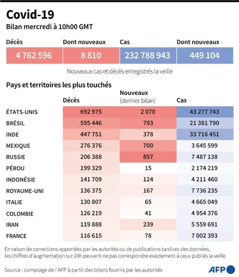 La pandémie a fait au moins 4.762.596 morts dans le monde depuis fin décembre 2019, selon un bilan établi par l'AFP à partir de sources officielles mercredi 29 septembre en milieu de journée.