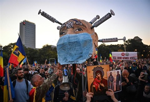 | Manifestation anti-vaccin à Bucarest le 2 octobre. |