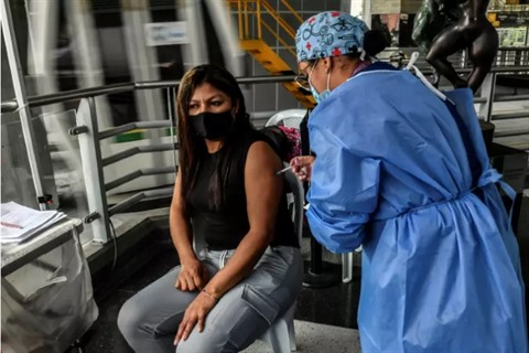 | Une femme se fait administrer le vaccin chinois CoronaVac contre le COVID-19, à Medellin, le 3 octobre. |