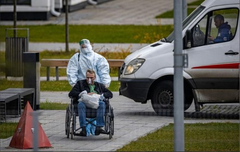 | Un professionnel de santé emmène un patient vers l'unité soignant les personnes malades du COVID-19 de l'hôpital Kommunarka, près de Moscou, le 15 octobre. |