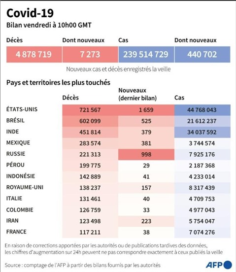 La pandémie a fait au moins 4.878.719 morts dans le monde depuis fin décembre 2019, selon un bilan établi par l'AFP à partir de sources officielles, vendredi 15 octobre en milieu de journée.