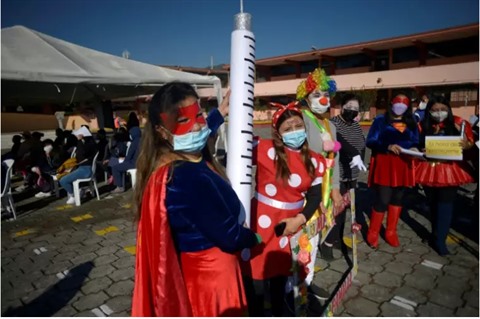 | Des enseignants déguisés au début d'une campagne de vaccination des enfants de 6 à 11 ans avec une dose du vaccin CoronaVac, à Quito, le 18 octobre. |
