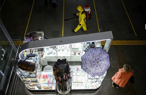 | Un employé du ministère russe des Situations d'urgence désinfecte une garde à Moscou, le 19 octobre. |