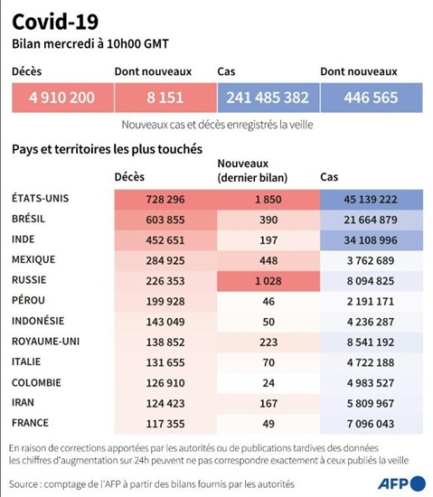 La pandémie a fait au moins 4.910.200 morts dans le monde depuis fin décembre 2019, selon un bilan établi par l'AFP à partir de sources officielles, mercredi à la mi-journée 20 octobre.