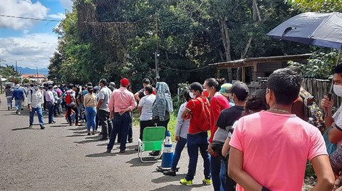 | Des centaines de personnes font la queue pour se faire vacciner contre le COVID-19 à Guasaule, ville du Honduras frontalière avec le Nicaragua, le 22 octobre. |