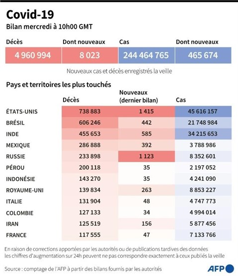 La pandémie a fait au moins 4.960.994 morts dans le monde depuis fin décembre 2019, selon un bilan établi par l'AFP à partir de sources officielles mercredi en milieu de journée. Les États-Unis sont le pays le plus endeuillé avec 738.883 morts, suivis du Brésil (606.246), de l'Inde (455.653), du Mexique (286.888) et de la Russie (233.898).