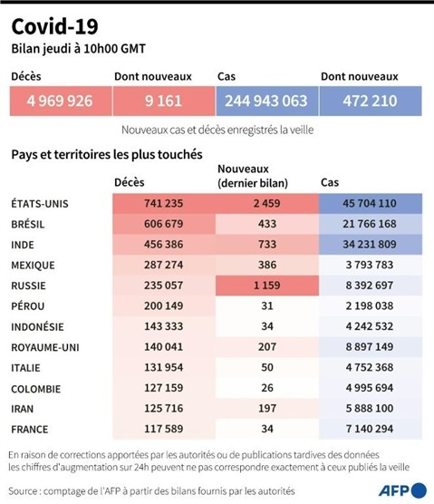 La pandémie a fait au moins 4.969.926 morts dans le monde depuis fin décembre 2019, selon un bilan établi par l'AFP à partir de sources officielles jeudi 28 octobre à la mi-journée.
