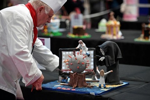 | Un gateau inspiré par la pandémie de COVID-19 présenté à l'ouverture de "Cake International" à Birmingham, dans le Centre de l'Angleterre, le 5 novembre |