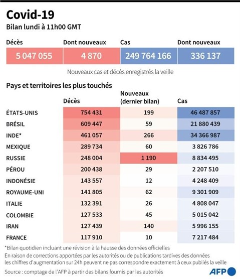 La pandémie a fait plus de 5.047.055 morts dans le monde depuis fin décembre 2019, selon un bilan établi par l'AFP lundi 8 novembre à 11h00 GMT. Les Etats-Unis sont le pays ayant enregistré le plus de décès (754.431), devant le Brésil (609.447) l'Inde (461.057), le Mexique (289.734) et la Russie (248.004).