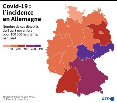 | Carte de l'incidence (nouveaux cas sur 7 jours pour 100.000 habitants) par Land en Allemagne, du 2 au 8 novembre. |