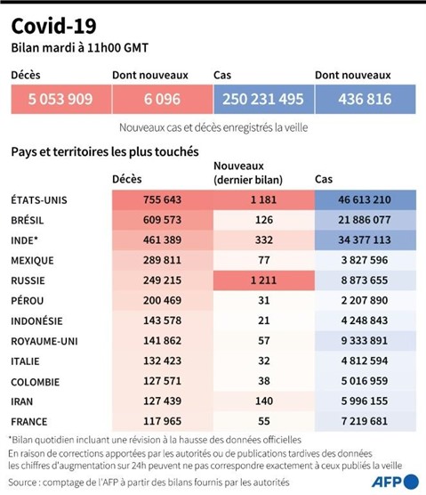 La pandémie a fait plus de 5.053.909 morts dans le monde depuis fin décembre 2019, selon un bilan établi par l'AFP mardi 9 novembre à 11h00 GMT.
